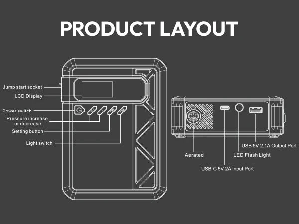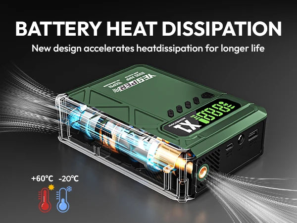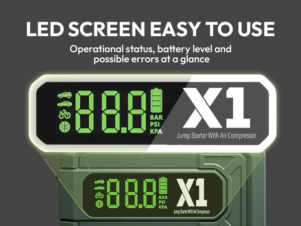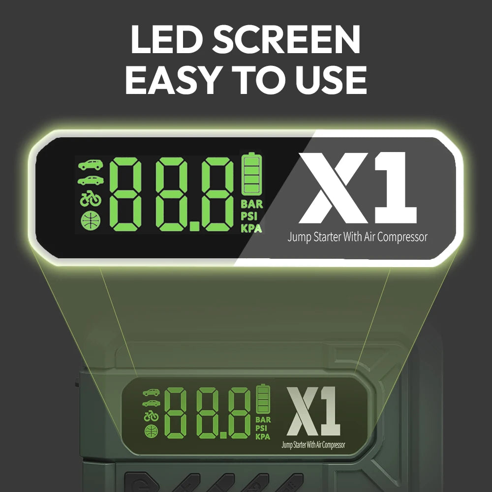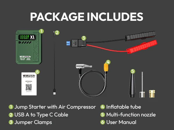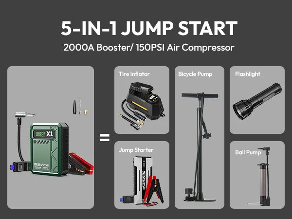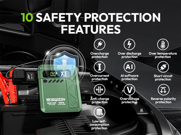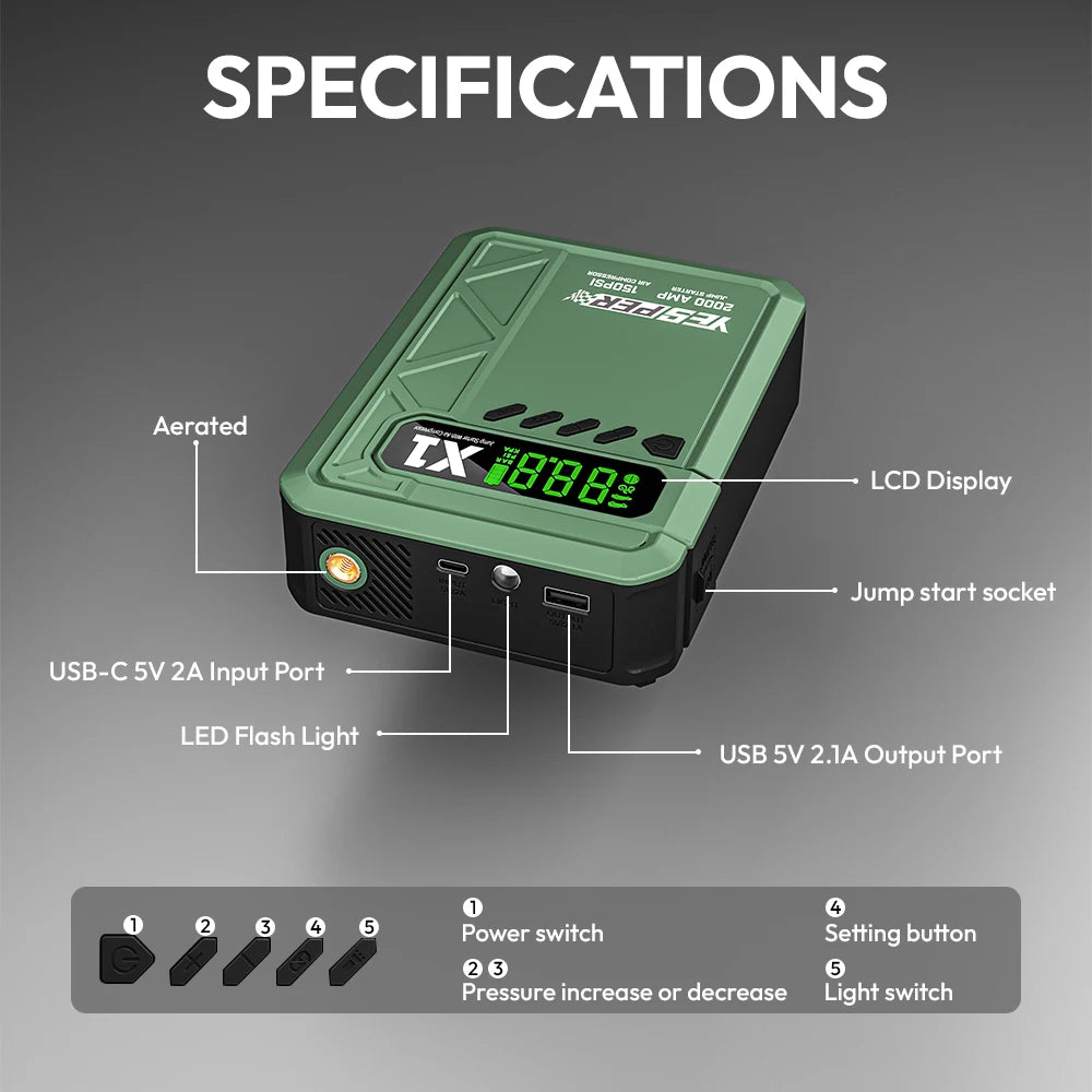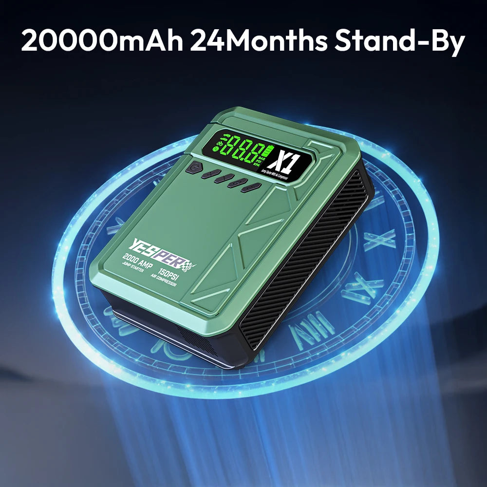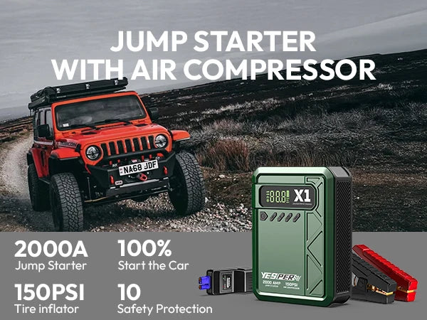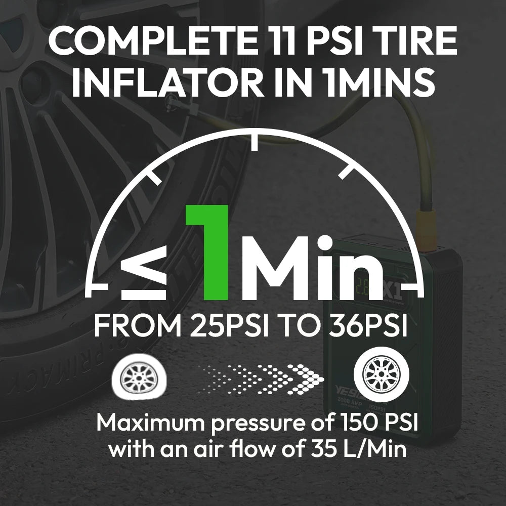 YESPER Arrancador con compresor de aire 2000A 150PSI batería arrancador portátil (8L Gas/6L Diesel), cargador de batería de 12 V con cables de puente, pantalla LCD.